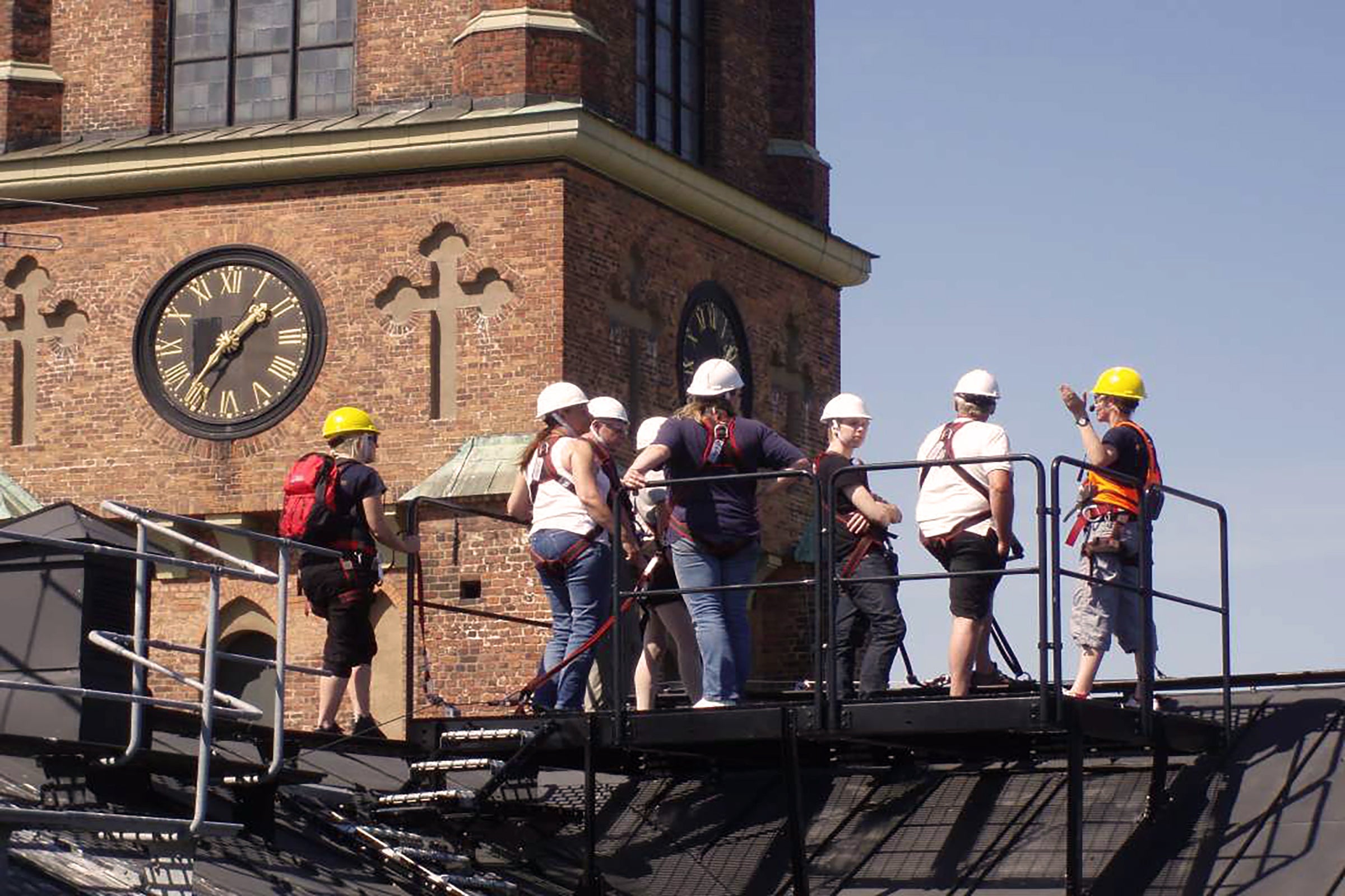 Väl uppe på vinden så kommer du att ta på dig all utrustning som behövs för en säker upplevelsen. Du kommer vara fast kopplad i skyddsanordningar som är monterat på taken under hela vandringen. När all säkerhet är på plats är ni redo att bege er upp på taken!